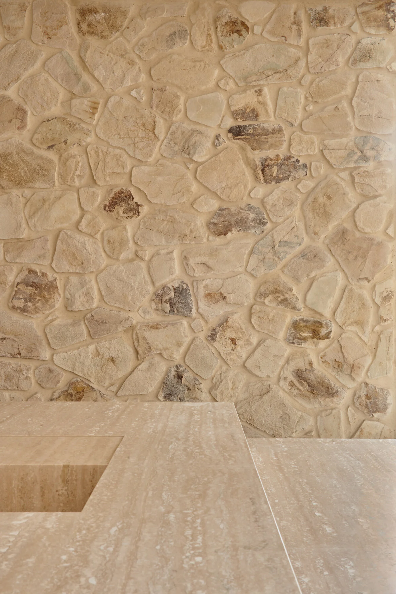 Studio 11:11 took cues from the architectural design and used them in various scales and applications for the interior. An example of this is the play on intersecting volumes, a dynamic stacking of blocks and forms. The exterior rock walls wrap inside in selected areas, connecting indoor to outdoors.