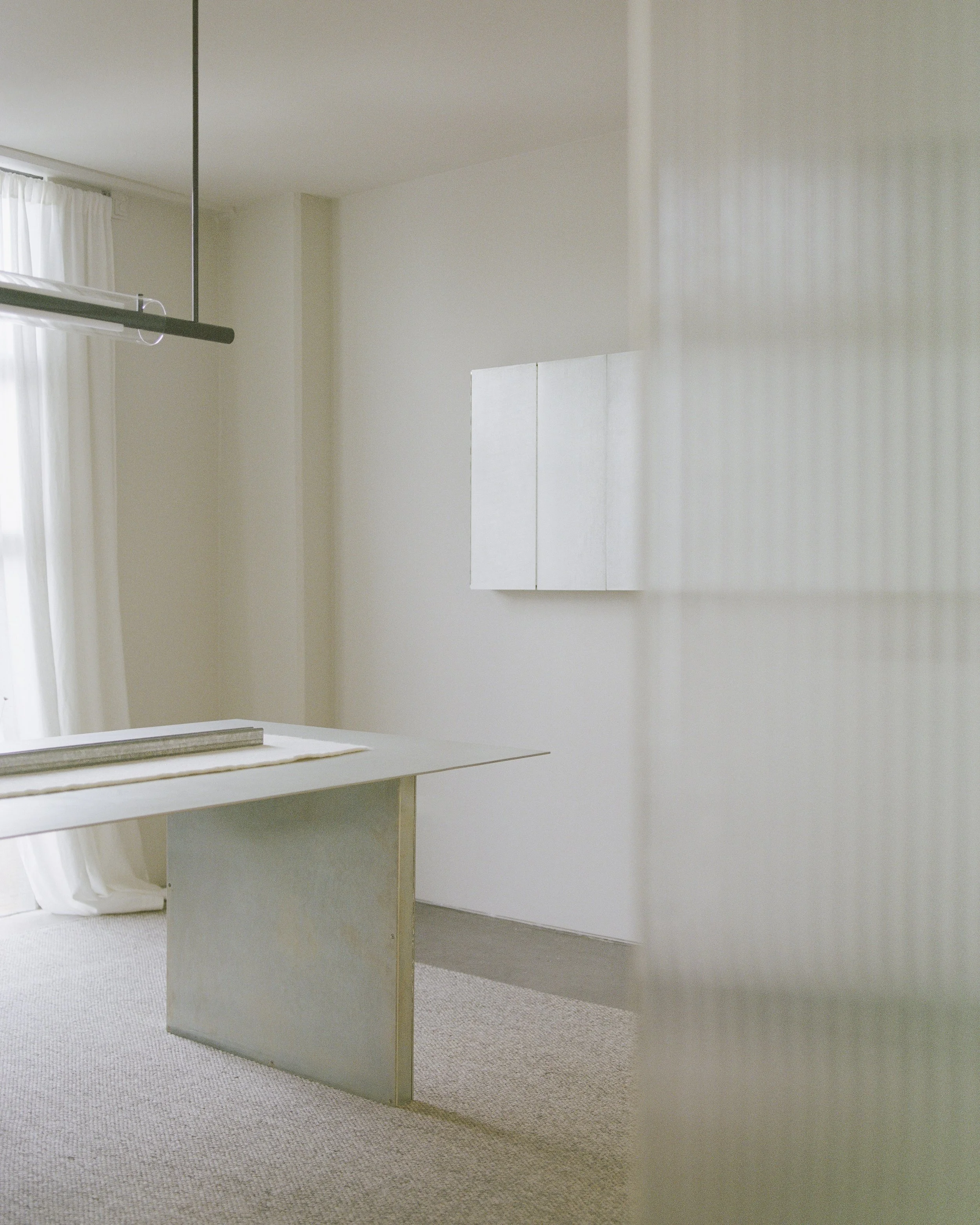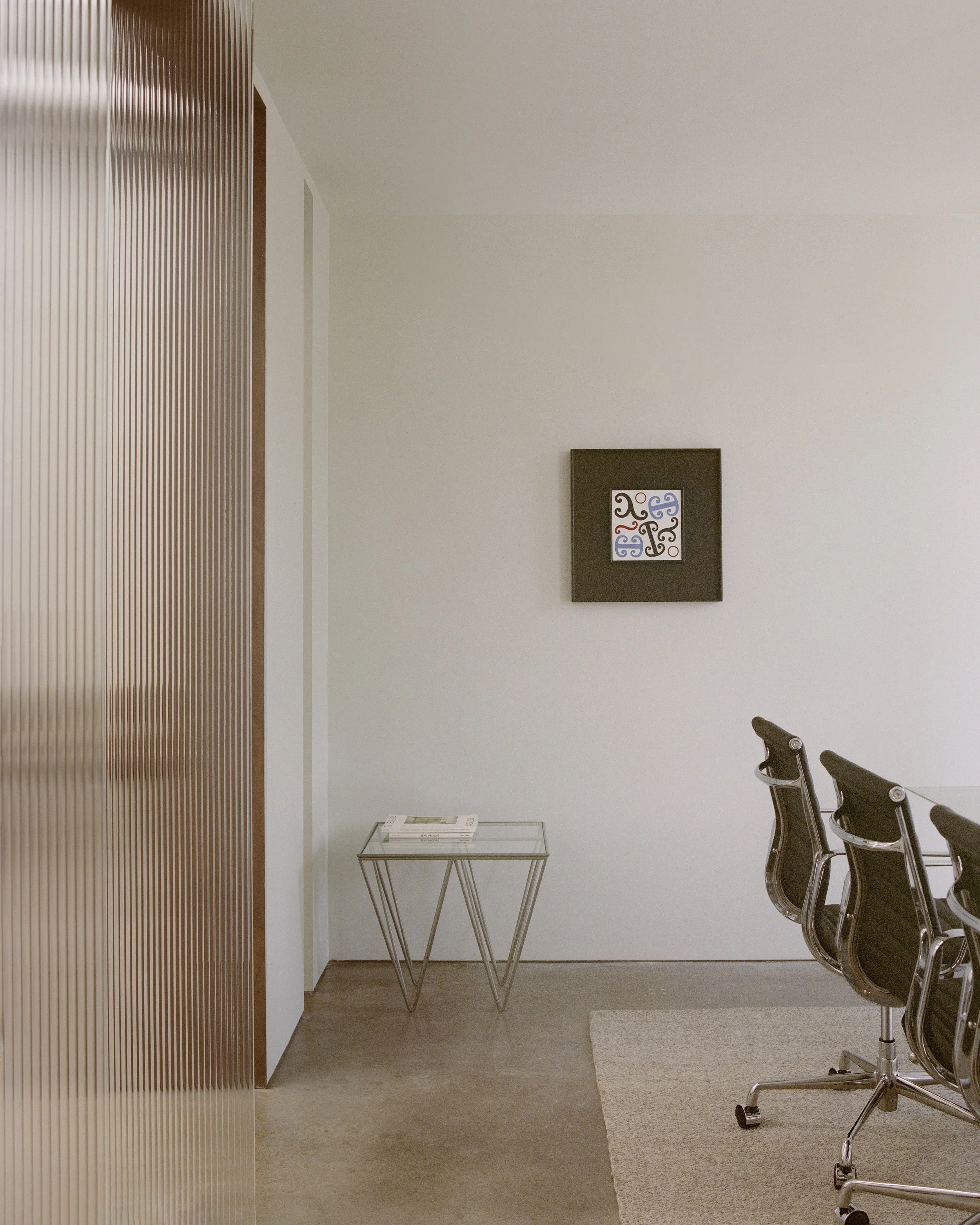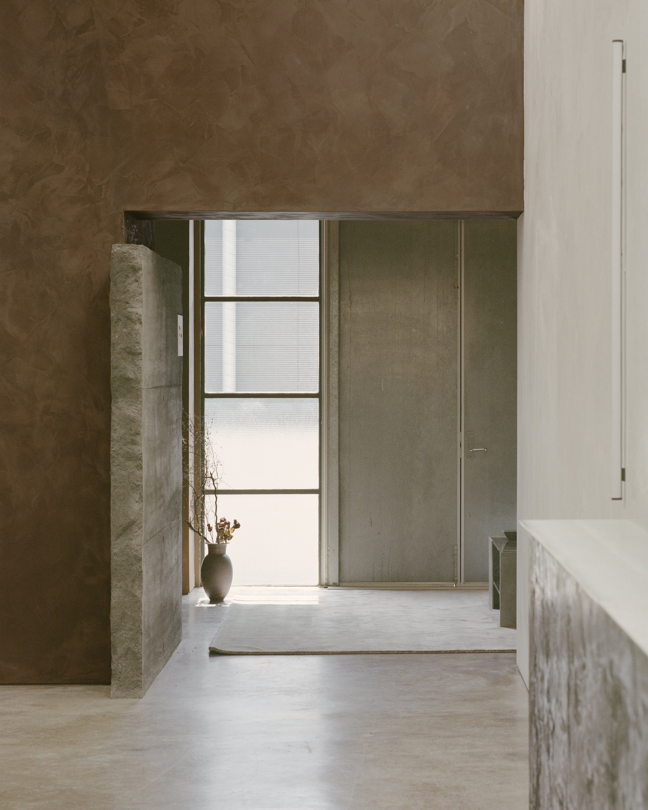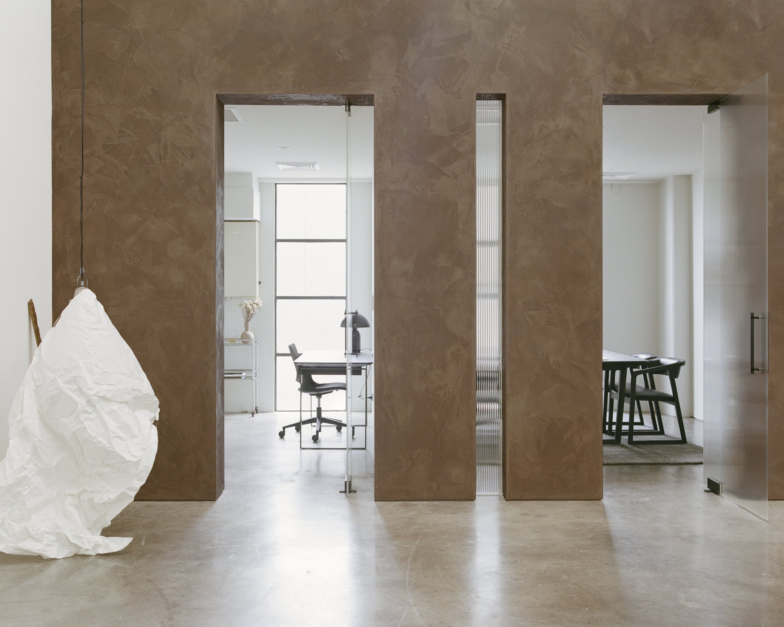 Material choices respect the building’s industrial character while adding texture and warmth. Galvanised sheet steel, textured paint, poured in-situ basalt slabs, and textured glass pivot doors were paired with softer elements like a raw wool wall hanging, which doubles as acoustic treatment. The result is a harmonious blend of hard and soft finishes that feels both grounded and inviting.