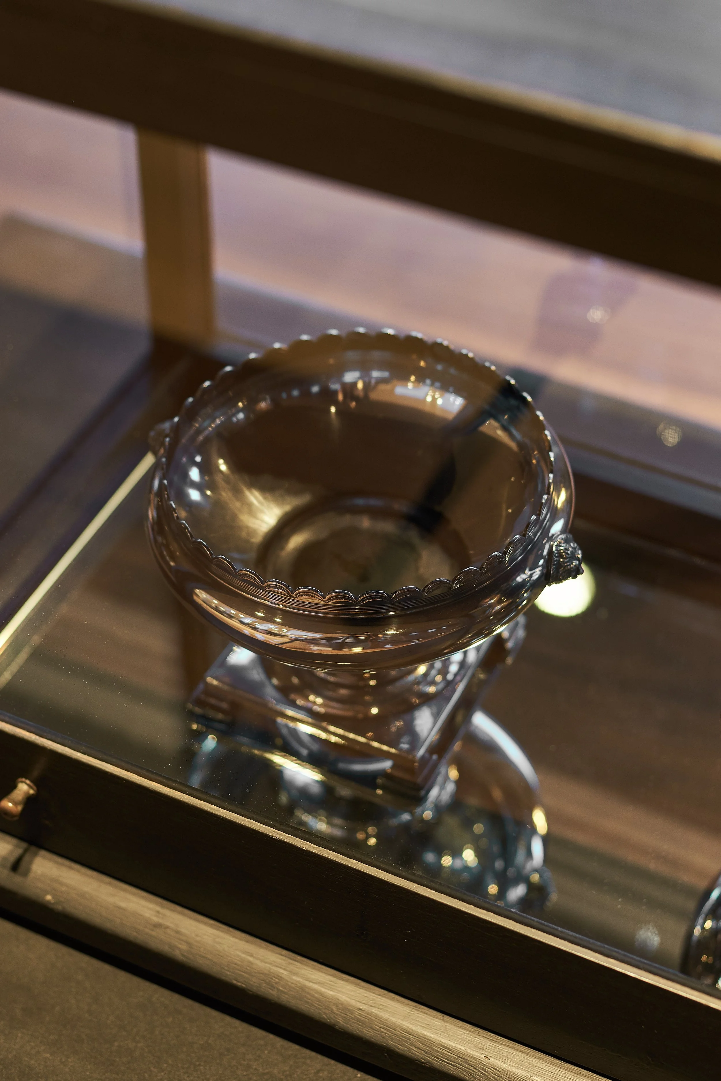 An artfully designed central table continues this story. Solid walnut timber is offset by the insertion of modern concrete monoliths. On top of these plinths, a landscape of glass vitrines house more of the curio, inviting people to gather around a central focus and view the collection of artifacts over a cup of coffee.